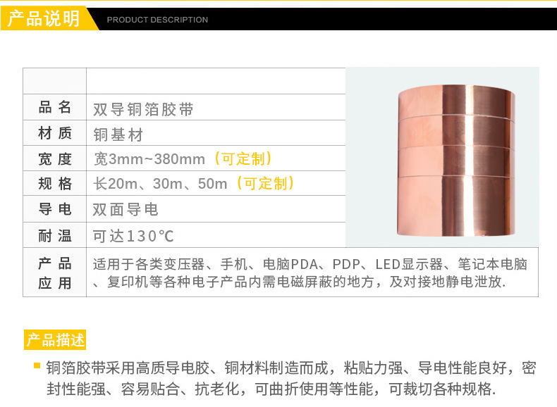名称:双面导电铜泊胶带(又名:双导自粘铜箔胶带)